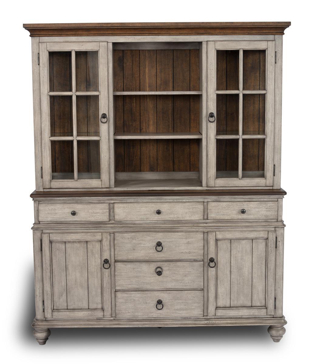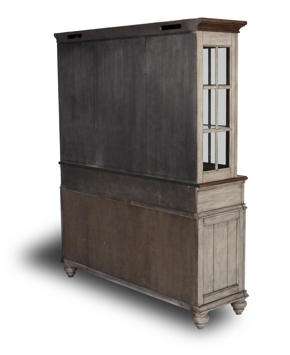- Distressed two-tone whitewash wood finish with top surface in a dark wood finish