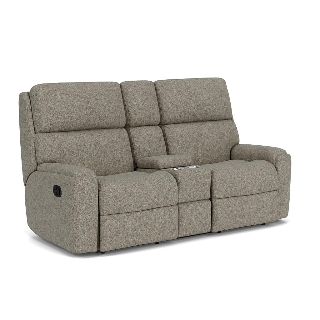 Whether you're watching a movie or gearing up for gaming, the Rio Reclining Loveseat with Console keeps you comfy and puts items like remotes and beverages close at hand. The spacious center console includes storage for glasses, magazines and other personal items, along with two cup holders. Using an easy-access parachute release on either arm, you can seamlessly transition from sitting to reclining. Designed to keep you comfy for hours, Rio has divided back cushions that support your back from neck to lower lumbar. Inset padded armrests have a refined look and take pressure off your forearms, no matter how long you're lounging. Our patented Flexsteel DualFlex Spring System™ provides firmness and flexibility—and ensures structural durability, even if things get rowdy. To make Rio your own, choose from over 250 fabric options that will remain looking good for years to come.